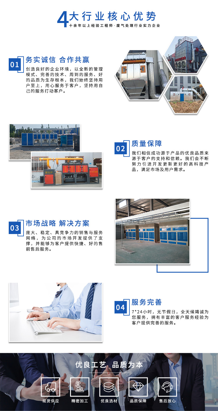 公司自成立以來,始終專注于工業(yè)廢氣、污水、粉塵等環(huán)境污染的治理,先后研發(fā)出催化燃燒設(shè)備、光氧催化廢氣處理設(shè)備、低溫等離子廢氣處理設(shè)備、粉塵處理-體化設(shè)備等一系列環(huán)保設(shè)備,產(chǎn)品先后通過ISO901質(zhì)量管理體系認(rèn)證、中國(guó)環(huán)境保護(hù)產(chǎn)品認(rèn)證。